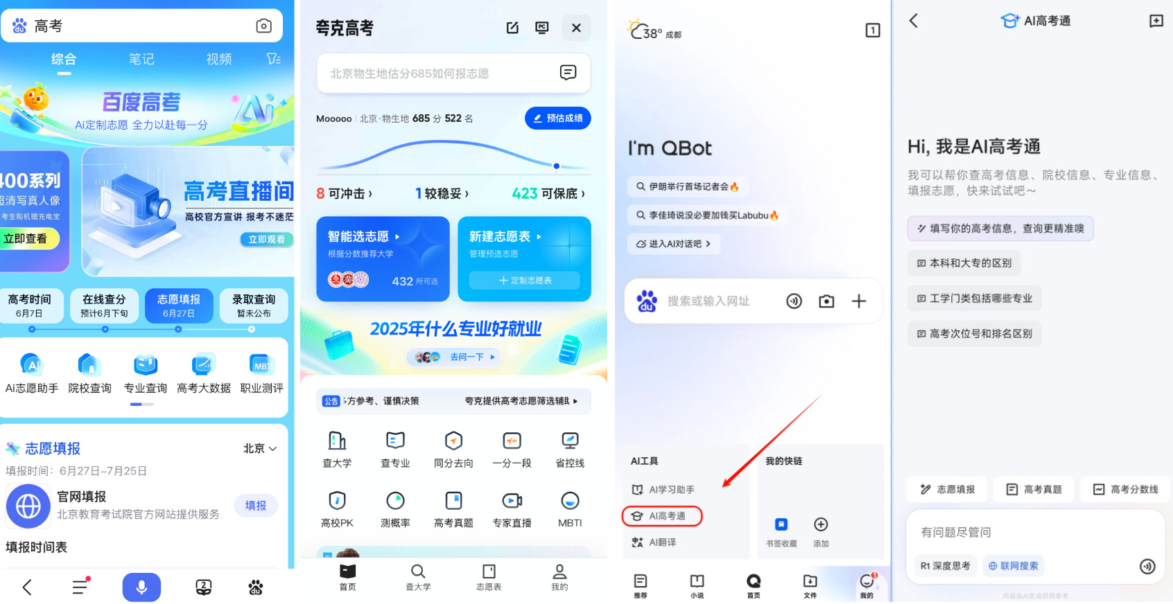 百度很早就推出了“AI志愿助手”,可联调文心一言、DeepSeek、通义千问等多个大模型,包含科学冲稳保、AI聊志愿智能体和免费测试MBTI等三个核心功能。基于⽇均数⼗亿次搜索数据,还推出权威独家⾼考⼤数据,为考⽣提供决策信息。