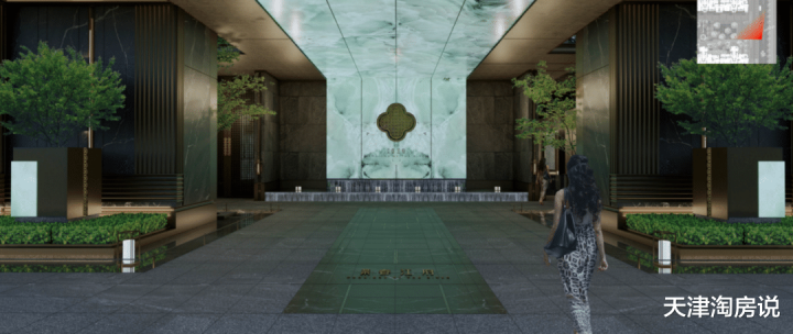 迎面是巨大的海棠纹花窗,采用翡翠色彩的发光石,底部用叠瀑分隔,形成迎宾叠水。
